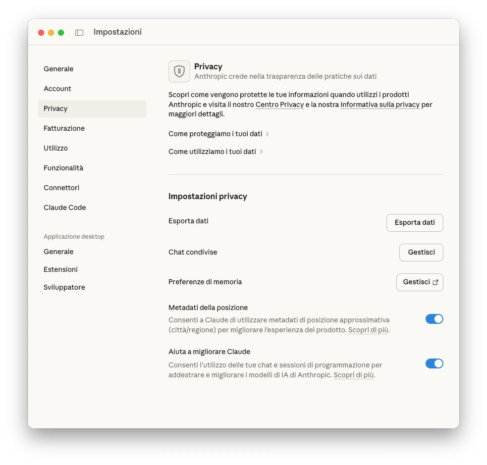 La voce da disattivare per l'opt-out menzionato in tabella è quella in fondo: "Aiuta a migliorare Claude". Io l'ho lasciata attivata perchè avendo sia l'abbonamento PRO che quello TEAM, uso il PRO solo per alcuni test comparativi rispetto al TEAM e non con dati sensibili.