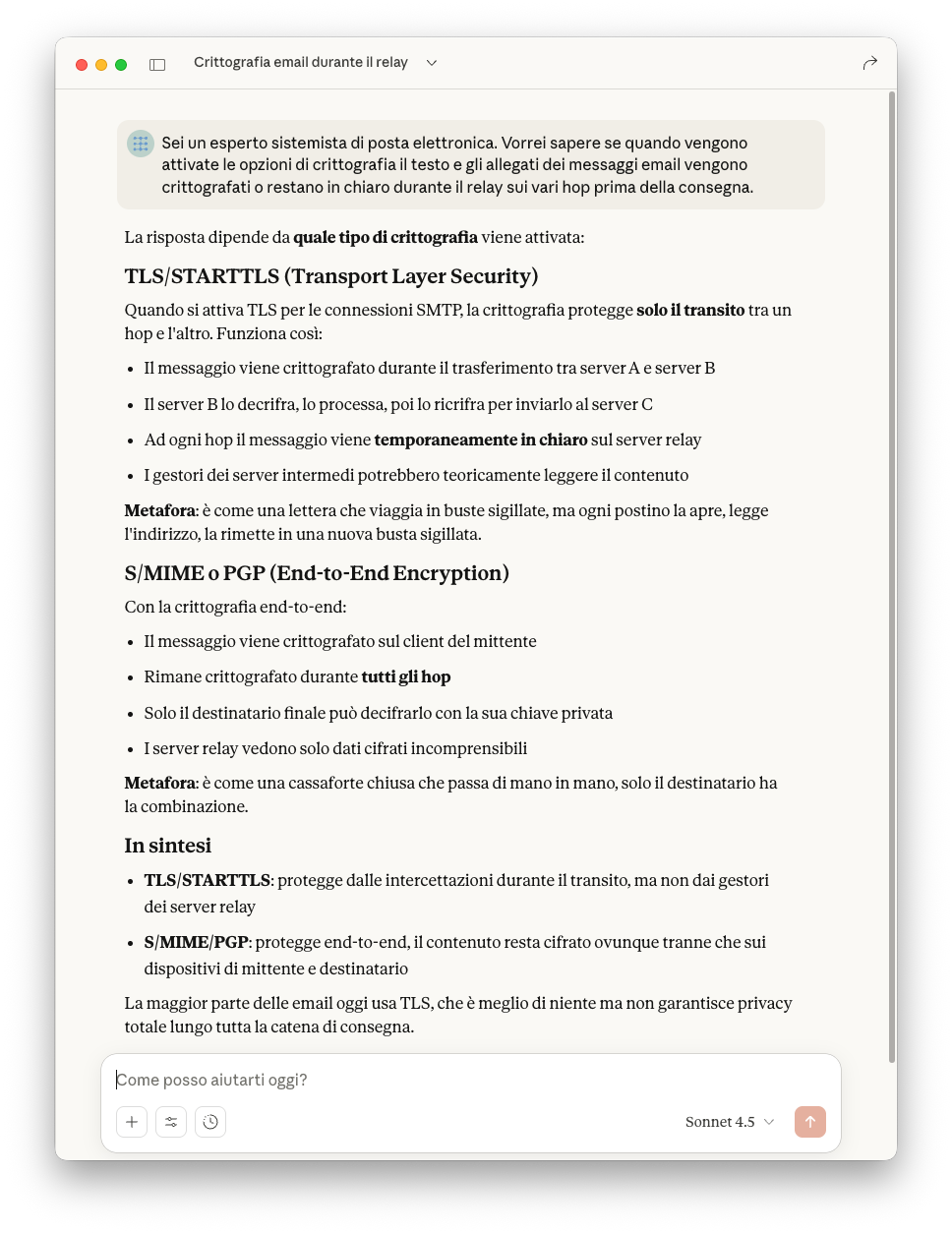 Breve storia informatica: la posta elettronica nasce negli anni 70 come un sistema di messaggistica ideato per scambiare messaggi di testo in chiaro tra utenti dello stesso server. Poi è arrivata Internet e le università hanno iniziato ad usare la posta elettronica tra server diversi. Le aziende ne hanno scoperto l'utilità e la cosa è dilagata, tanto che nei primi anni 2000 la posta elettronica è diventata il sistema portante della comunicazione aziendale, ma un giorno qualcuno ha detto: ok, ma qui è tutto in chiaro, infatti bastava collegarsi ad una porta di rete con un qualunque computer e si potevano "ascoltare" tutti i messaggi inviati e ricevuti. Da quel giorno è nato il protocollo TLS che permette di criptare il contenuto dei messaggi durante il transito da un server all'altro. Purtroppo questo non ha risolto definitivamente il problema. Il protocollo email non essendo nato per tutelare la privacy ancora oggi necessita che i messaggi ad ogni passaggio vengano aperti e interpretati dal server di posta per poterli instradare. Anche il servizio anti-spam legge il testo completo dei messaggi, e in alcuni casi anche gli allegati.