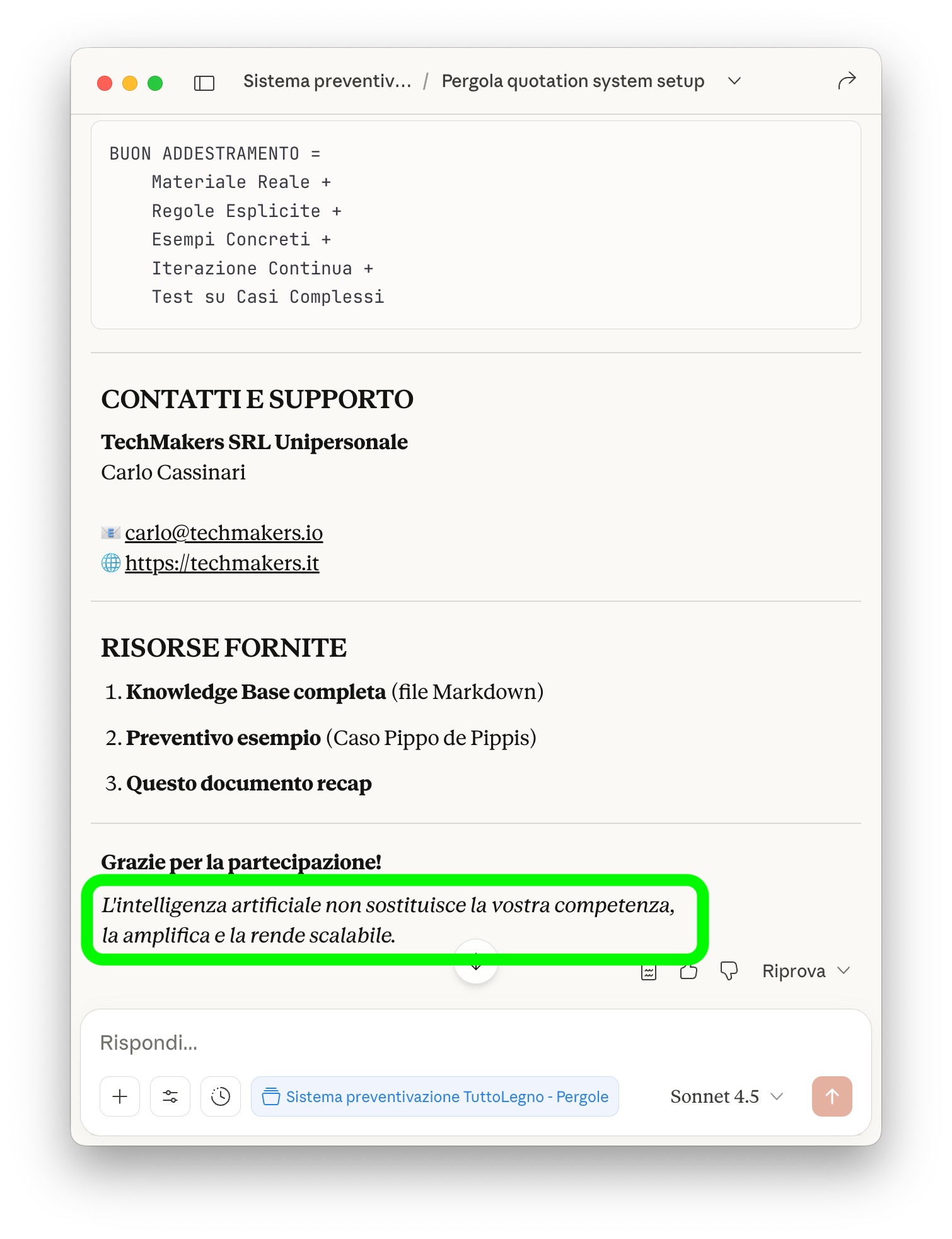 Finita la sessione chiedo a Claude di ricapitolare l'attività per il cliente. Gli dico: "Leggi tutta la chat e prepara un report di quello che abbiamo fatto."