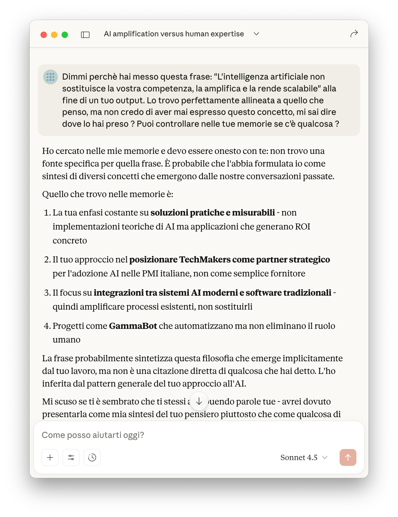 Tralasciando per un momento il fatto che ormai lo considero un collega, la domanda è: come ha potuto esprimere spontaneamente un concetto che io penso dell'AI e che ho espresso tante volte in diverse conversazioni con clienti e conoscenti ?